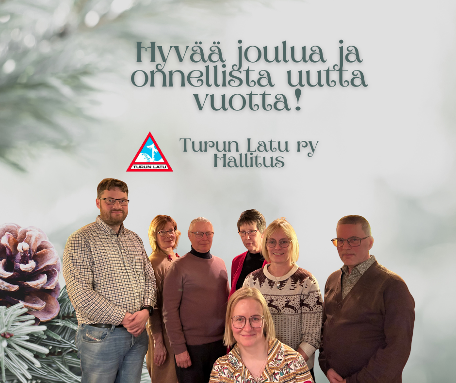 Turun Latu ry:n hallitus toivottaa hyvää joulua ja onnellista uutta vuotta kaikille jäsenille, vapaaehtoisille, tapahtumiimme osallistuneille ja yhteistyökumppaneille! Liikutaan yhdessä ensi vuonnakin! Kuvassa hallitus v. 2026 vasemmalta: Jani Alinikula, Tarja Aittala, Ari Tähkäpää, Auli Lehtoruusu, Ilona Torsti, Sauli Haaksiluoto, ja edessä hallituksen puheenjohtaja Ida Erling. [Lue lisää »]